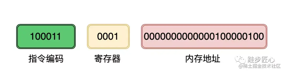 中间 4 位,指定了寄存器的编号,“0001” 表示 R1 寄存器。