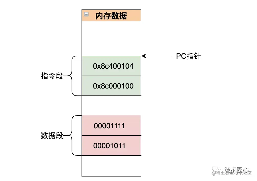 程序的指令和数据分别存入内存指令段和数据段中,PC 指针指到指令段的起始地址。