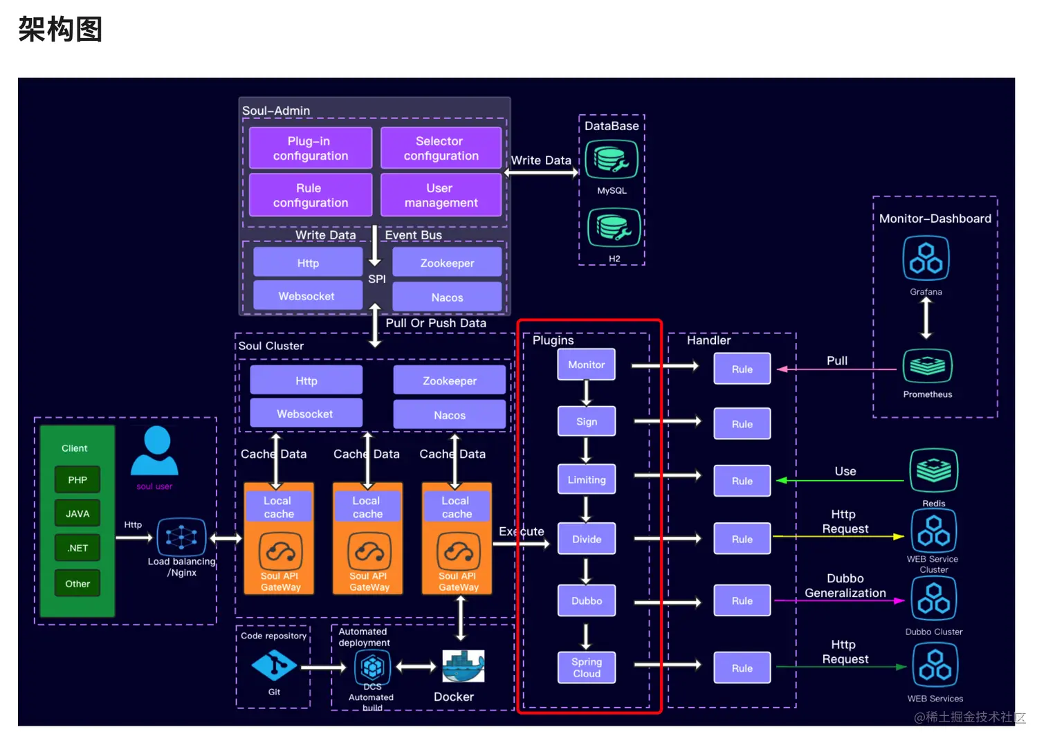Soul 使用了插件化设计思想,实现了插件的热插拔,且极易扩展。内置丰富的插件支持,鉴权,限流,熔断,防火墙等等。