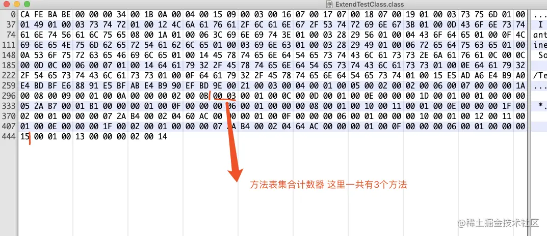 从0x0003开始是方法表集合计数器的开始,表明这里一共是3个方法我们结合class文件就能清楚看到