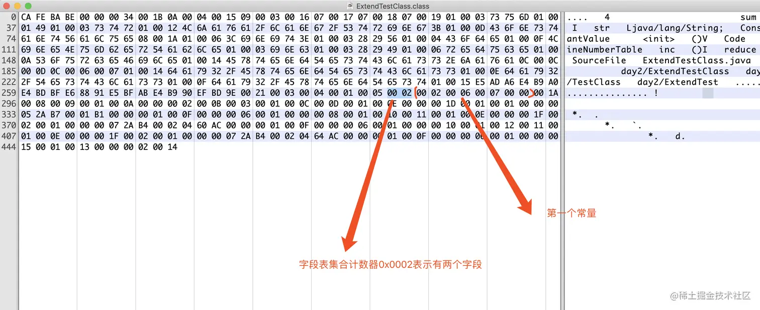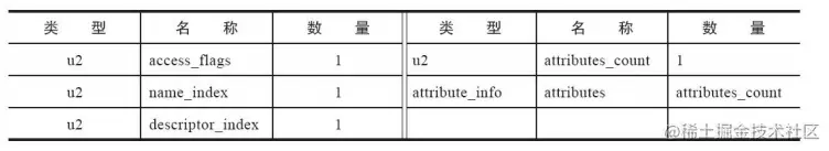 - u2 attributes_count: 0x0000 表示属性表集合计数器,0x0000表示没有属性表集合这项描述