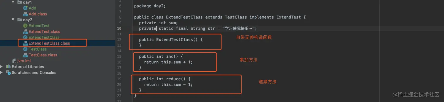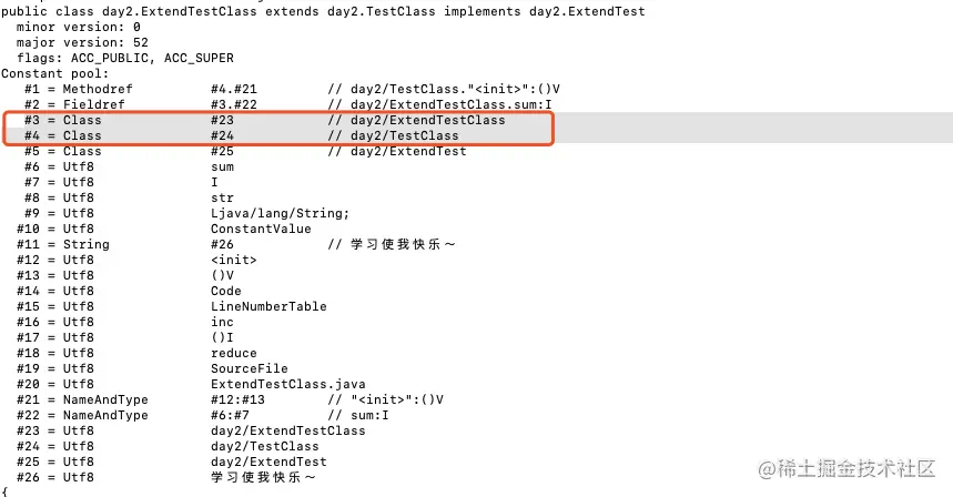 为了尽量保证字段的完整性,我们重新写一个类,来分析这三块 这个类继承了父类TestClass,实现了ExtendTest接口