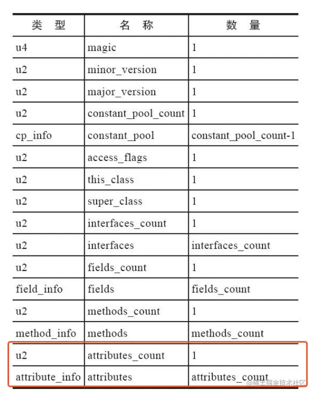 属性表集合除了在字段表集合和方法表集合中存在以外,在class字节码的最后两个类型字段就是单独用来描述属性表集合的。