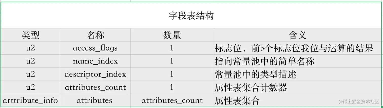 字段表(field_info)用于描述接口或者类中声明的变量。Java语言中的“字段”(Field)包括类级变量以及实例级变量,但不包括在方法内部声明的局部变量。