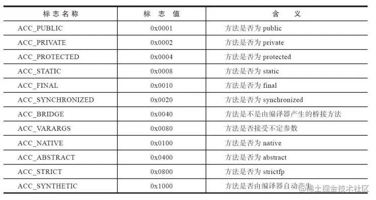 第一个参数access_flags是方法的访问控制符,和字段表的作用是一样的,但是其中的成分稍微有些不同