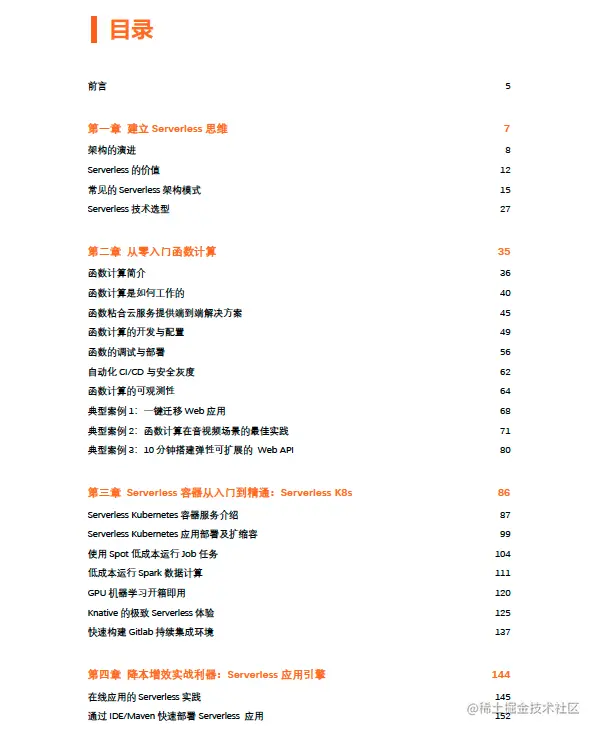 - 第 2 部分(第 2~4 章)结合业界流行的 Serverless 架构深挖运行原理,剖析落地案例。