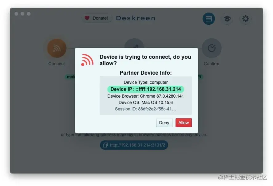 扫描二维码码跟或在浏览器地址栏中手动键入链接时,将看到如下消息框。以绿色突出显示的地址应与在计算机Deskreen应用程序和尝试连接的设备(例如电话,平板电脑)上看到的地址匹配,单击“允许”按钮。