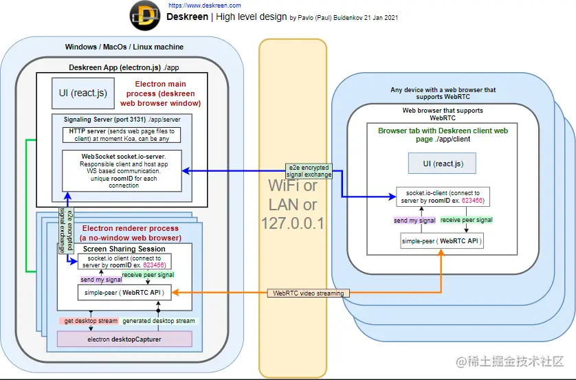 Deskreen 是一个基于 electron.js 的应用程序,使用 WebRTC 协议,将你的电脑桌面流实时传输到到任何设备上的 Web 浏览器。它构建在 Electron React Boilerplate 的顶层,并且为了获得更好的安全性,实现了端到端的加密,这受到了 darkwire.io的 启发。不同之处在于,它使用了 Typescript 重写,并且使用node-forge 代替了 window.crypto.subtle。这是因为客户端在没有 SSL 的情况下无法使用 window.crypto.subtle。Deskreen 的顶层设计图: