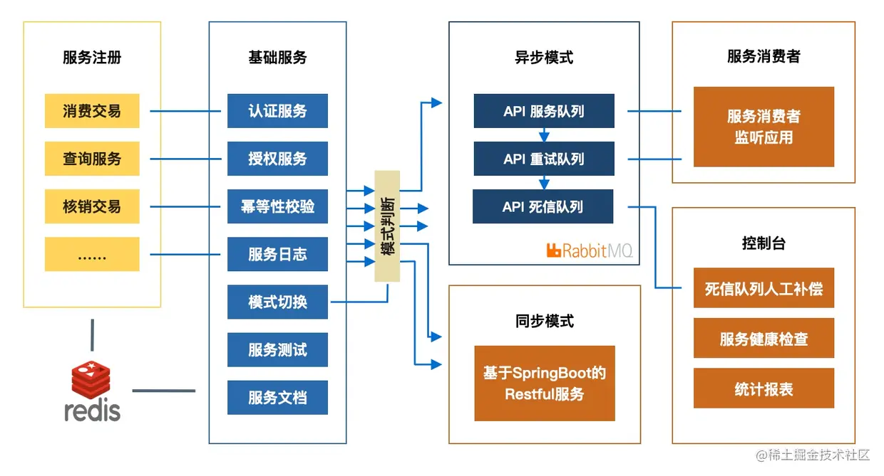 对于开发人员来说,他们只需要关注服务的业务逻辑开发,由应用框架统一处理服务的同步,异步切换,消息发送或失败时的异常处理,以及死信队列的维护等工作。