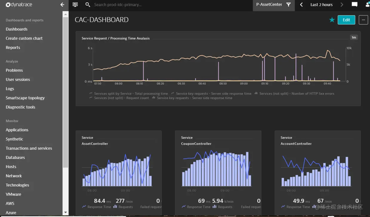 Dynatrace可能是目前最优秀的应用性能管理工具(APM),它既能监控基础设施如服务器,K8S容器,又能自动发现并监控在容器内运行的动态微服务,了解它们如何执行、相互之间如何通信,还能立即检测出性能不佳的微服务。在我们的案例中,通过定制dashboard添加我们所需要关注的监控数据。