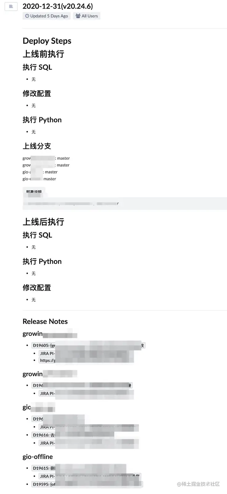 部署成功后 QA 团队会发送 Release 邮件,通知公司全体成员本次发布的版本中包含的详细内容,即部署前准备工作中的 「Jira Release Notes」 和「工程 Release Notes」。