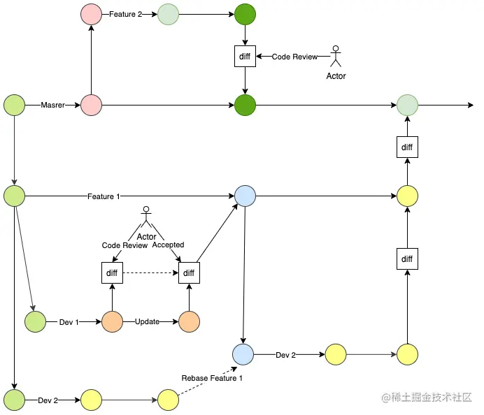 如果代码仓库的一个 Featrue 分支只有一位开发人员工作,可以直接 push,如 Featrue 2 分支,当代码通过集成测试后再提交 Diff 进行 Coded Review,CR 通过后进入主干分支。不过即使只有一个开发人员也建议使用提交 Diff 的方式向 Feature 分支提交代码,防止最后提交的的 Diff 过大,不利于 CR