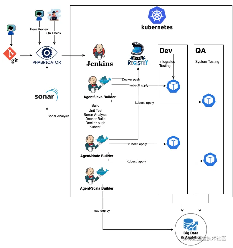 对于前端和服务端应用是打包成 Docker 镜像进行部署在对应分支的 K8S 环境,对于数据端应用是打包成 zip 包部署到基于 VM 的环境。