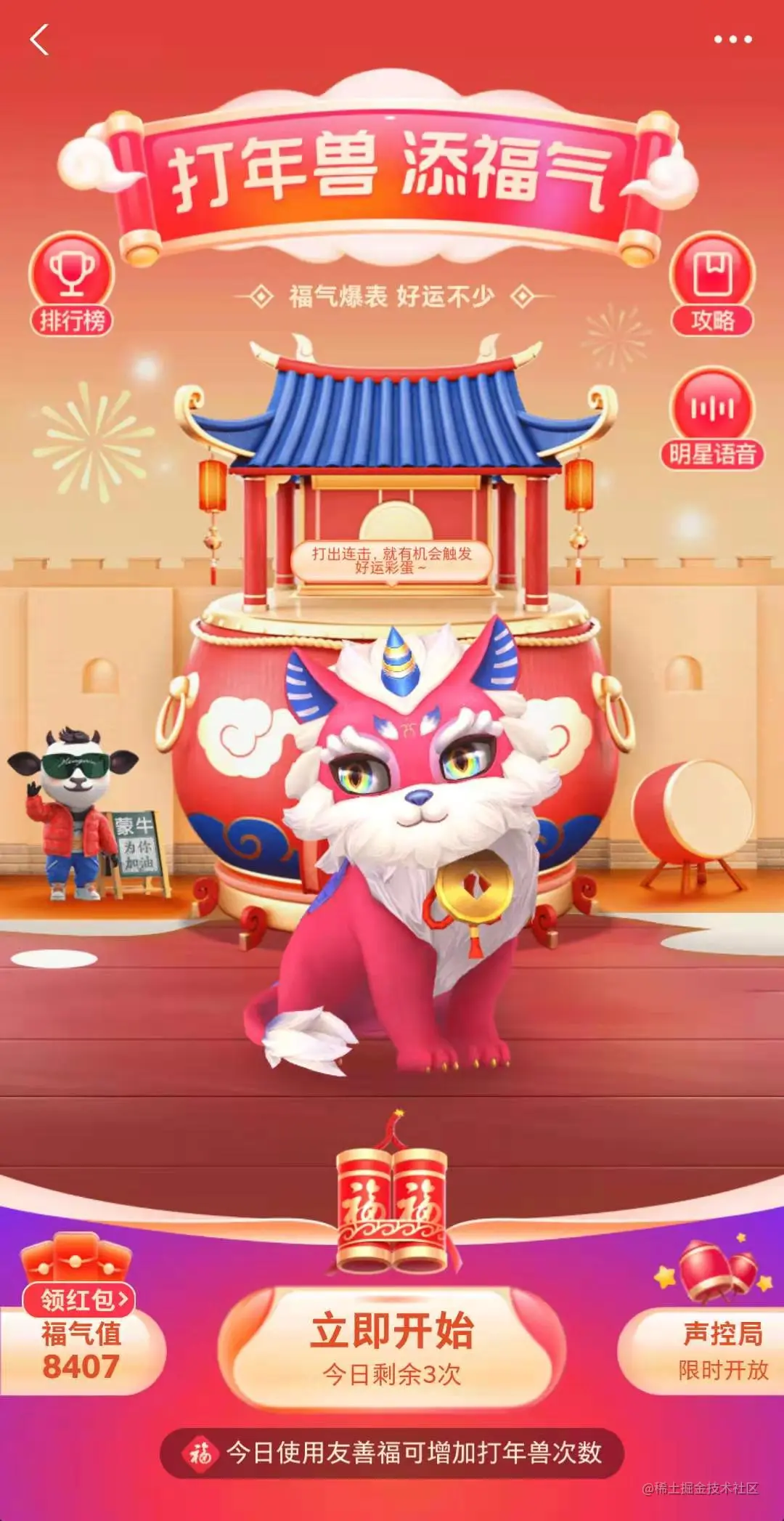 打年兽分为点击局和声控局的,点击局每天有3次机会,机会用完后可以用两张福卡再额外兑换两次机会