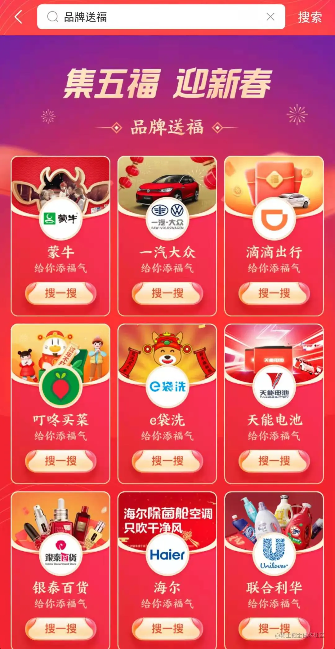 打开支付宝在顶部搜索框中搜索品牌送福,会看到一个集合了各个大品牌的页面