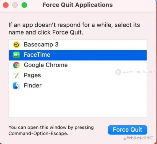 1.单击左上方的Apple徽标,然后选择“强制退出”。也可以按Command + Option + esc。
