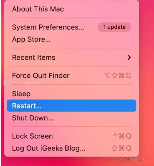 1.点击左上方的Apple徽标,然后选择重新启动。