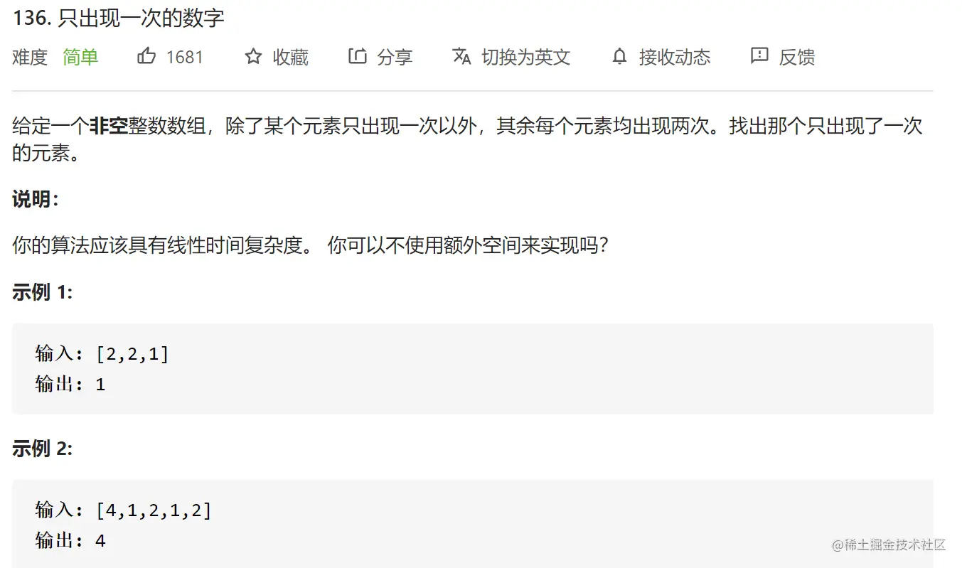 a⊕b⊕a = b⊕a⊕a = b⊕(a⊕a) = b⊕0 = b扫一遍,把每个数都异或一下,最终结果就是只出现过一次的数字。