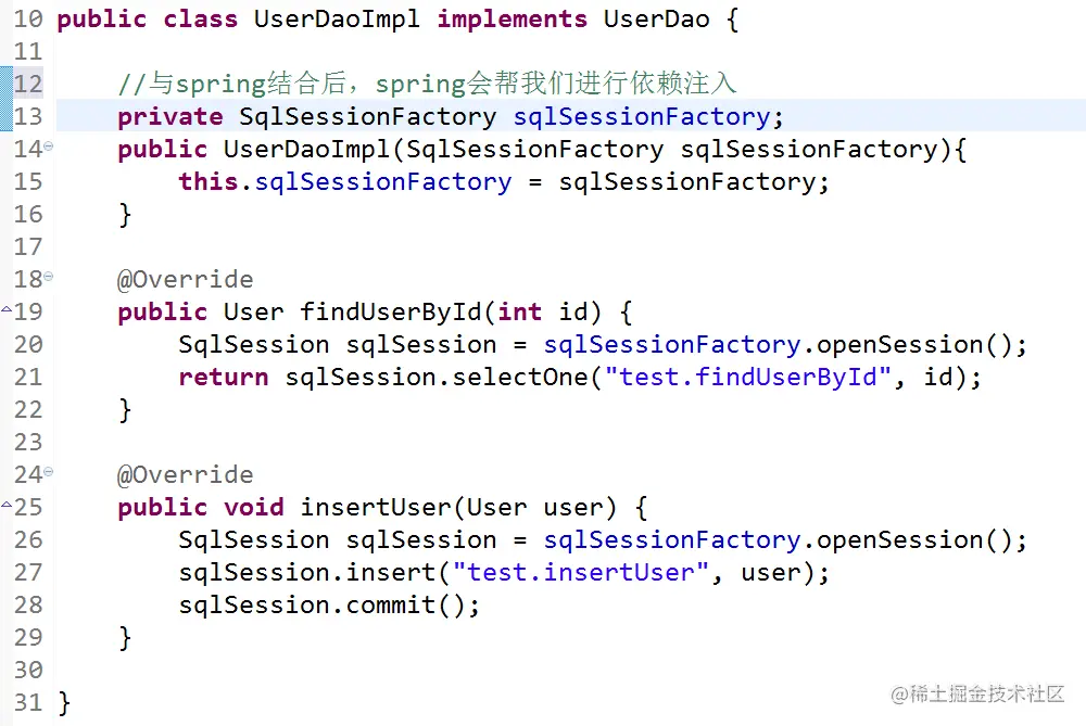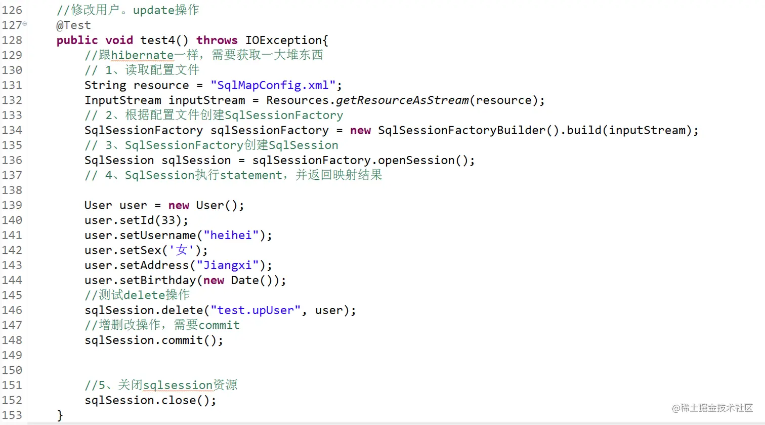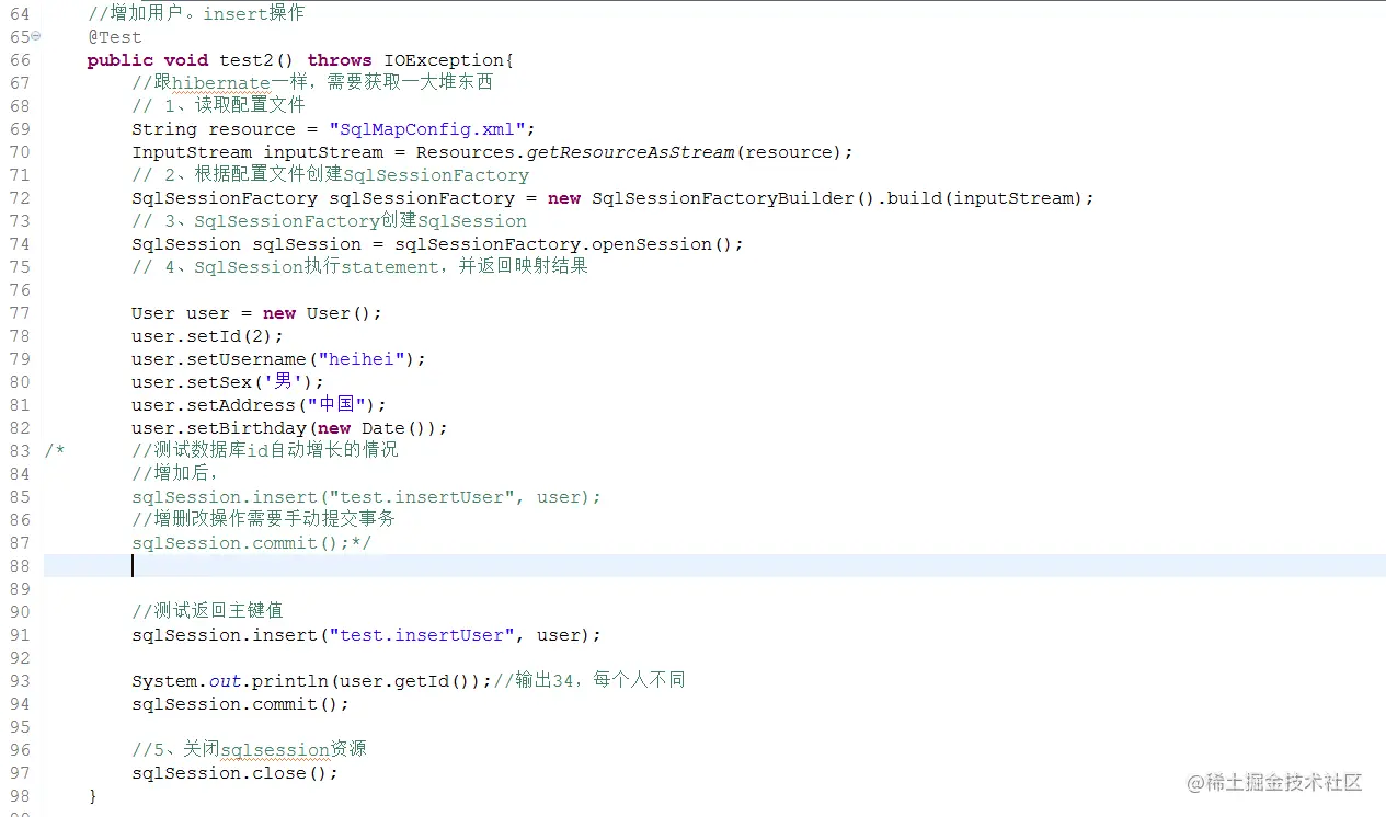 上面我们就单纯测试了使用mybatis对数据库的增删改查操作,在开发中,我们都是开发dao接口和dao实现类,那么就在dao实现类中调用sqlsession的方法对数据库的增删改差操作即可。