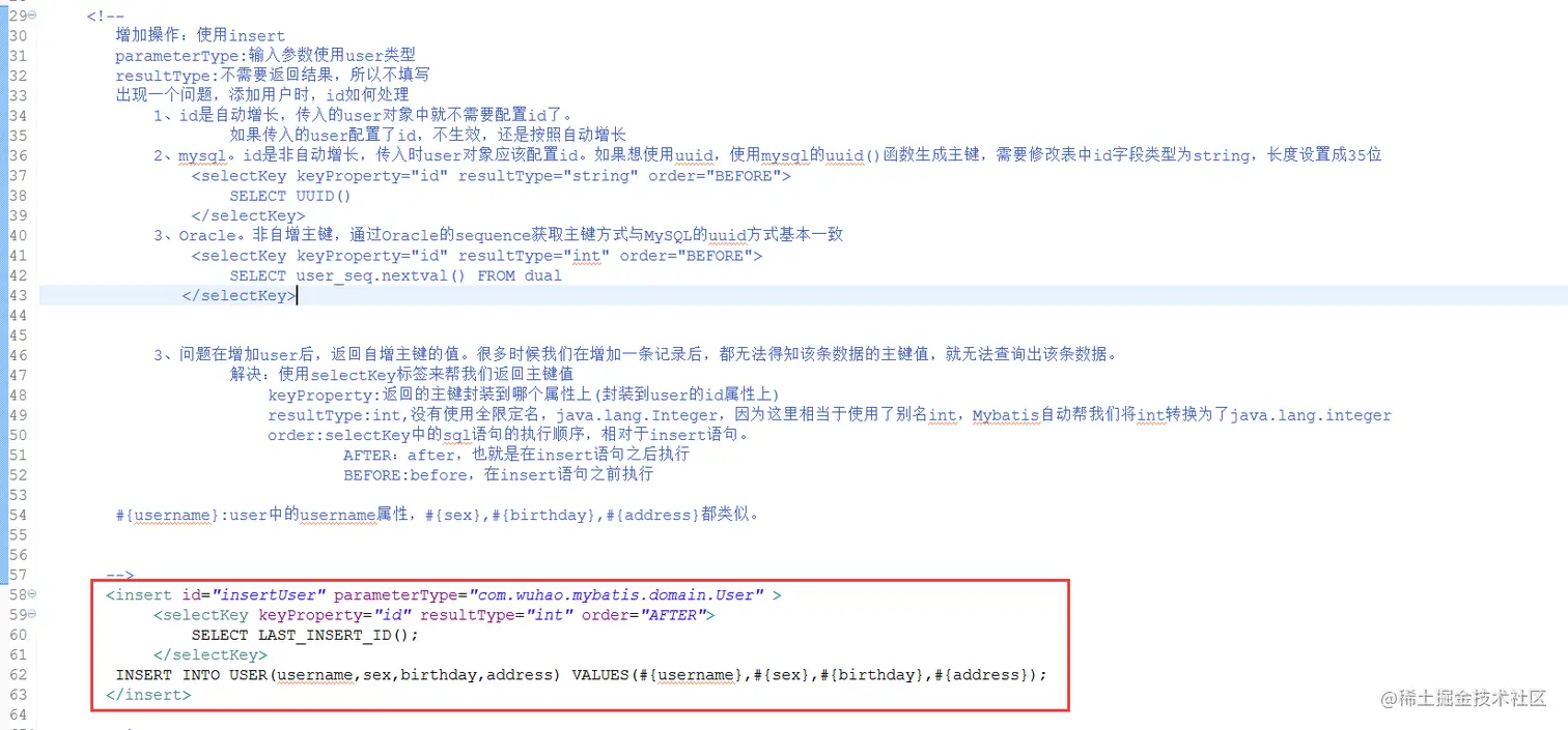 user.xml,insert操作,对主键id有几种不同的处理方式,具体看下图的解释