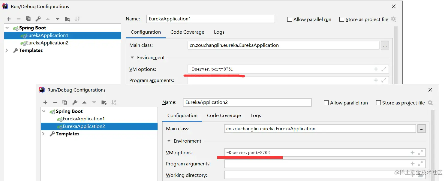 接下来我开启两个 EurekaServer,端口分别为 8761 与 8762: