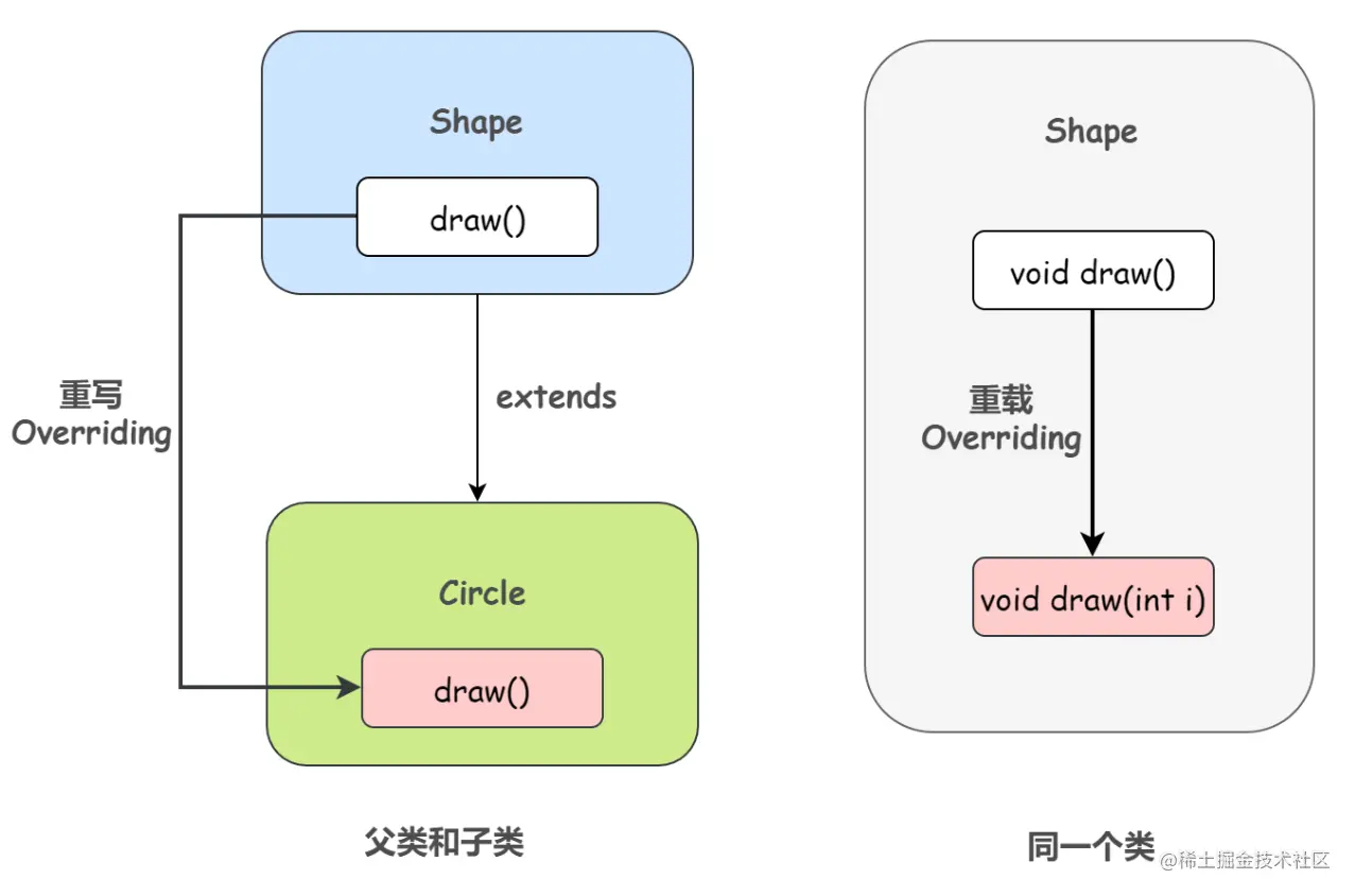 首先,我们需要知道方法的名字和参数列表称为方法的签名。例如,draw() 和 draw(String) 是两个具有相同名字, 不同签名的方法。如果在子类中定义了一个与超类签名相同的方法, 那么子类中的这个方法就覆盖/重写了超类中的这个相同签名的方法。