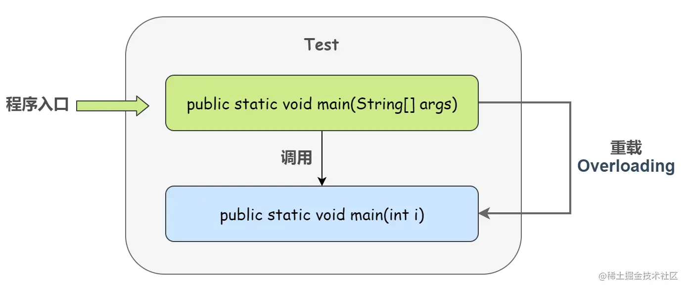 但是,如果是作为程序的入口,那么 main 函数只有一种写法,Java 虚拟机在运行的时候只会调用带有参数是 String 数组的那个 main() 方法,而其他重载的写法虚拟机是不认的,只能人为的调用。
