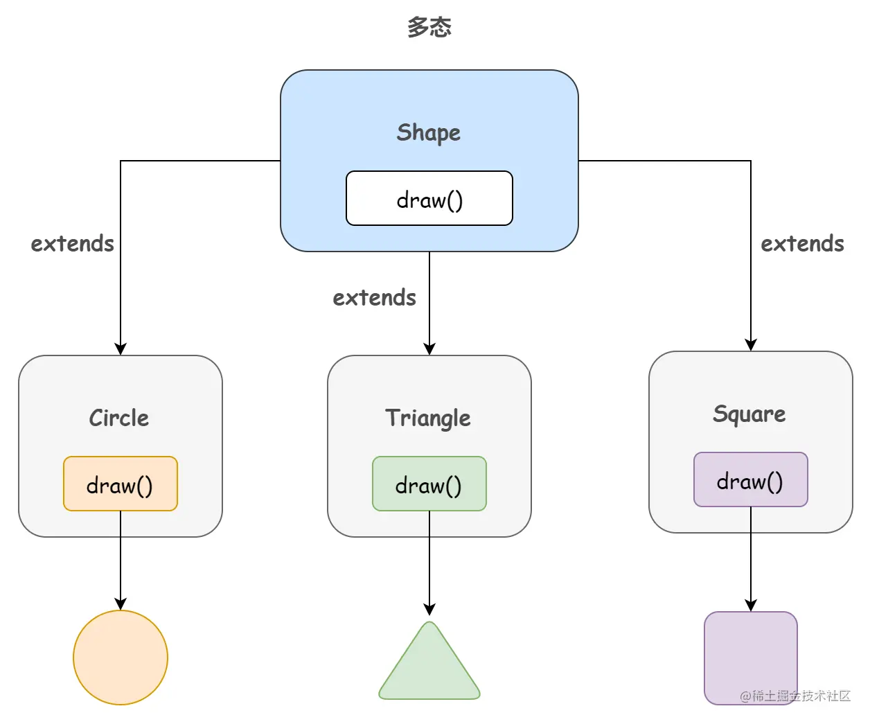 大家应该不会太陌生,就是上篇文章继承中提到的向上转型,没错,它就是多态的体现。同样的一个 draw 方法,在这三个不同的对象上产生了三种不同的行为,多态在此体现的淋漓尽致。