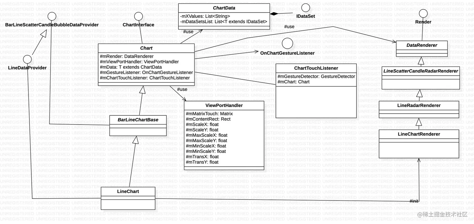 项目支持的图表很多,uml全部呈现显得比较繁杂,我们就以LineChart(线图)为例。尽量用最少的信息来理解该库的设计,所以我们只包含线图,不包含x轴/y轴/legend/markview等。