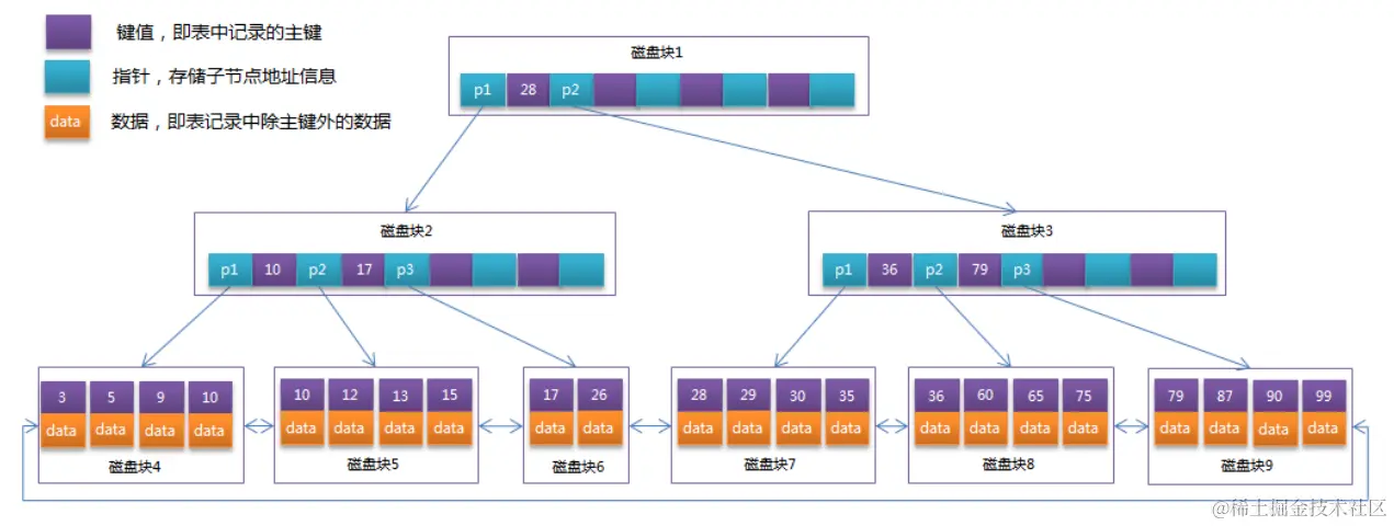 假如我们想要查找15和26之间的数据。查找路径是磁盘块1->磁盘块2->磁盘块5。