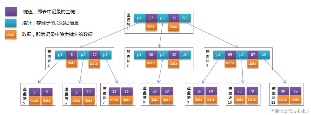 下面我们看一下,如何使用B树查询数据。 假如我们查询值等于15的数据。查询路径磁盘块1->磁盘块2->磁盘块7。