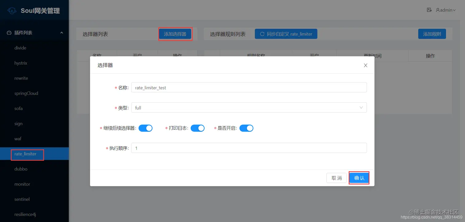 在 soul-admin–> 插件管理–> rate_limiter 将其设置为开启。