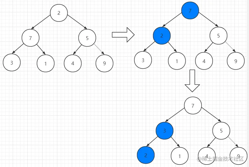 接下来我们只需要进行适当的调整大顶堆就可以了。我们注意到此时的根节点是相当比较小的,只需要把左右孩子中较大的和它交换位置,然后重复这个过程就可以了。