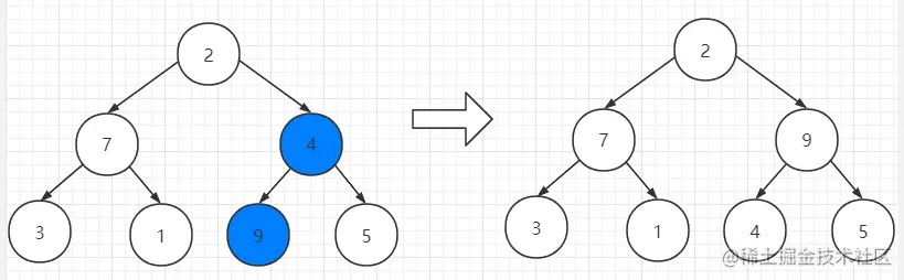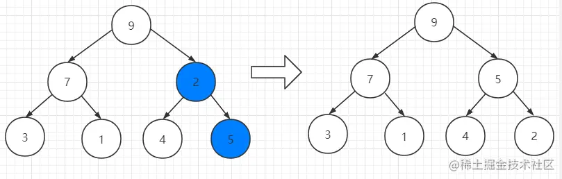 我们交换了2和9之后要注意被换下来的2是比4和5小的,所以要把5和2再交换一下。