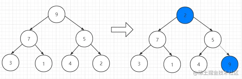 //2.将堆顶元素与末尾元素交换,最大元素沉淀到末尾