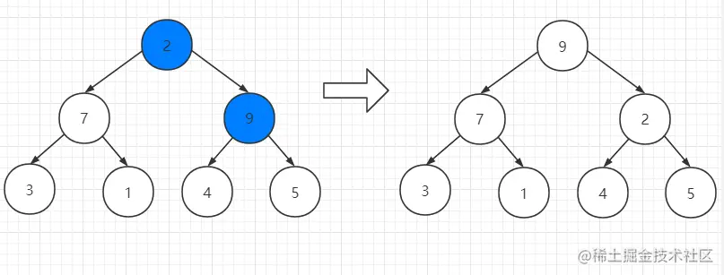 //当for循环结束后,已经将以i为父结点的树的最大值放在了最顶(局部)