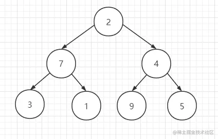 现在我们有一个待排序数组[2,7,4,3,1,9,5],初始状态是这样的: