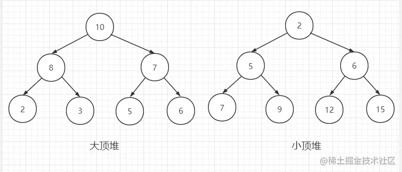 堆排序是一种树形选择排序方法,要了解堆排序就不得不了解一下堆。简单的说,堆是一种完全二叉树,根据父子节点之间的大小关系的不同还可以细分为「大顶堆」和「小顶堆」。大顶堆是指任一节点的值都大于或等于其左右孩子的值,小顶堆是指任一节点的值都小于或等于其左右孩子的值。下图分别是大顶堆和小顶堆的结构。