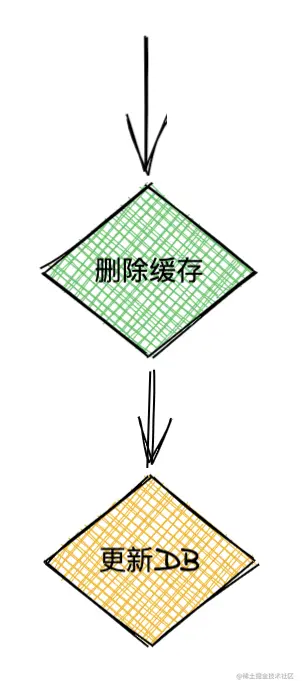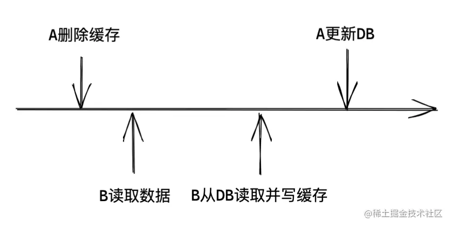 我们看两个并发请求的情况,A请求需要更新数据,先删除了缓存,然后B请求来读取数据,此时缓存没有数据,就会从DB加载数据并写回缓存,然后A更新了DB,那么此时缓存内的数据就会一直是脏数据,知道缓存过期或者有新的更新数据的请求。如图