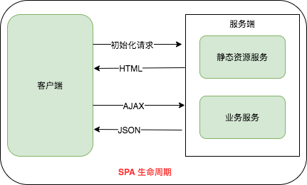 浏览器客户端一开始会加载必需的 HTML、CSS 和 JavaScript,之后的所有的操作都在这张页面上完成,由 JavaScript 来控制,通过某种数据格式和服务端产生交互,获取返回结果。