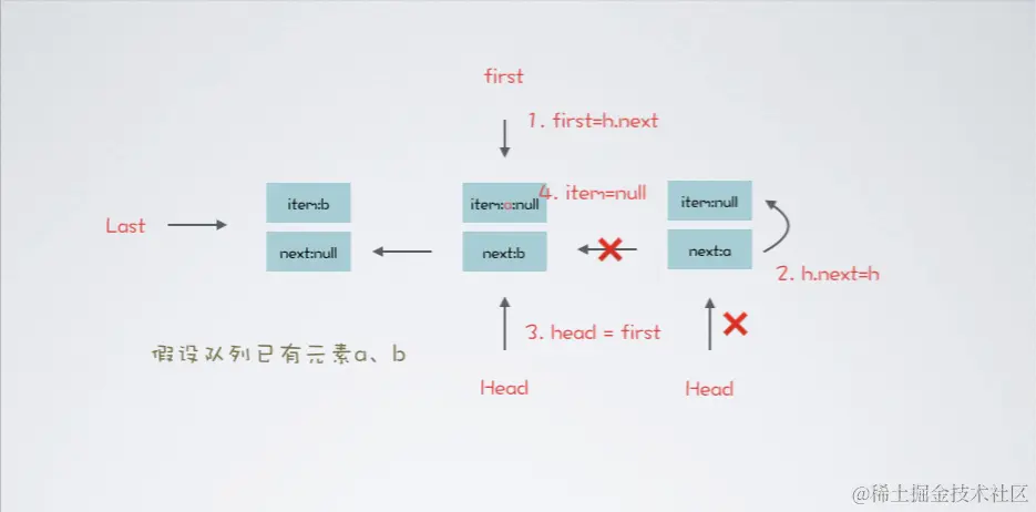 看到这里,能够得到结论,虽然 head 节点 item 永远为 null,但是 peek 方法获取的是 head.next 节点 item