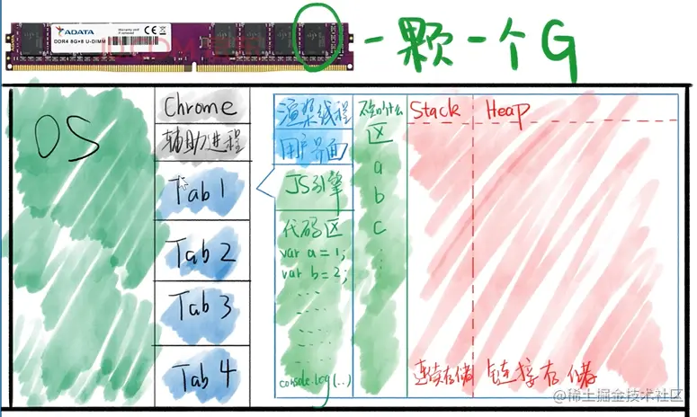 JS 一部分存代码 在不知道什么区里面 ,这个区是将环境存在这个去里面 同时还有变量名。例如 var a 。
