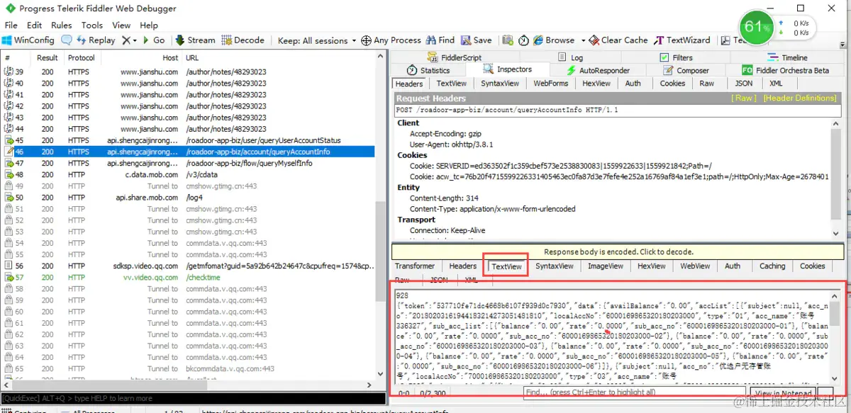 fiddler左边区域,选择需要查看的url然后点击,查看右侧区域。request区域默认展示headers部分, response区域默认展示Transformer部分,response区域默认展示按钮“Responsebody is encode,Click to decode”(译为:返回体已被编码,点击可解码),所以我们可以通过点击这个按钮查看解码后的response返回区域。