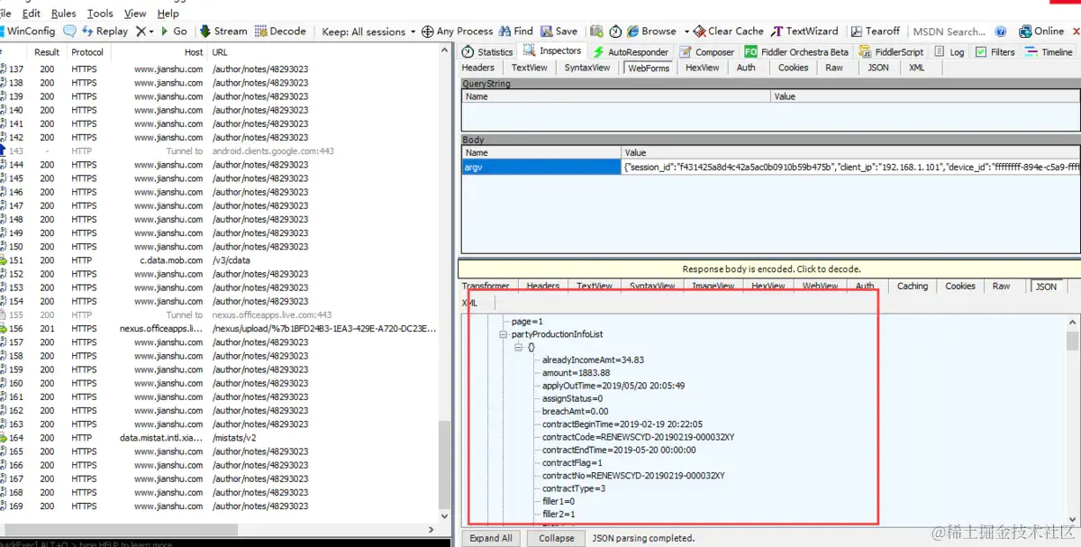 一般我们查看接口的入参和出参可以通过Inspectors窗口查看接口的request请求参数和response的返回参数。request请求参数一般选择TextView或者WebForms格式查看,response返回参数一般可以选择TextView或者JSON格式查看,若发现接口入参出参都是一串看不懂的数据,那肯定是你们开发加密了,不是明文显示。可以考虑找你们的开发给你们弄一个解密工具。