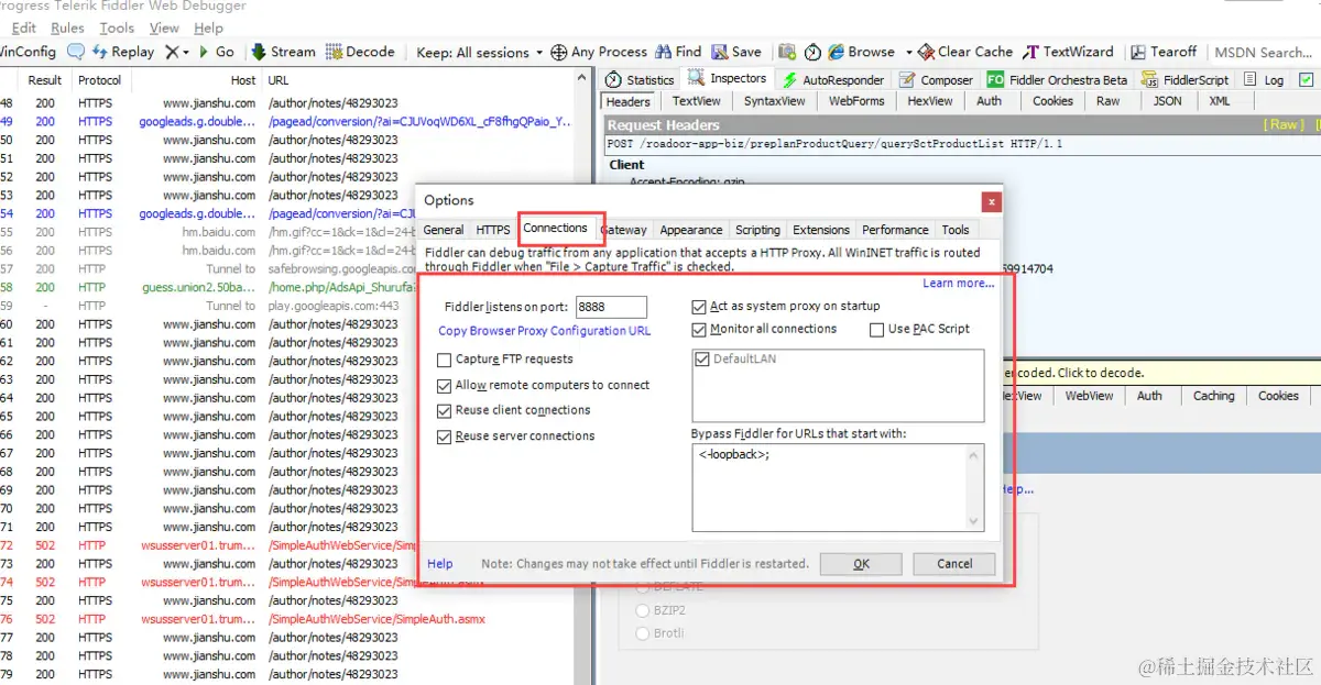 说明:①Fiddler listens on port是手机连接fiddler时的代理端口号,默认8888即可; ②Allow remote computers to connect是允许远程发送请求,需要勾上