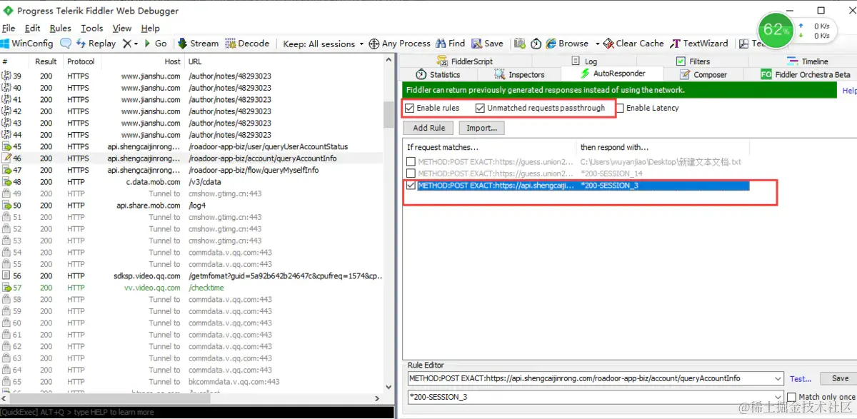再点击右边的AutoResponder,把刚刚编辑的那条url直接鼠标拖到空白框区域,然后勾选Enable rules和Unmatched requests passthrough。
