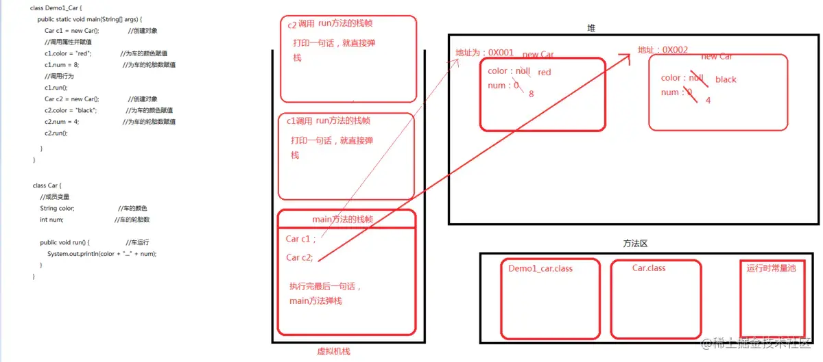 1、首先运行程序,Demo1_car.java就会变为Demo1_car.class,将Demo1_car.class加入方法区,检查是否字节码文件常量池中是否有常量值,如果有,那么就加入运行时常量池