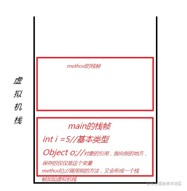 当在main方法中调用别的方法时,就会有另一个方法的栈帧入虚拟机栈,当该方法调用完了之后,弹栈,然后main方法处于栈顶,就继续执行,直到结束,然后main方法栈帧也弹栈,程序就结束了。总之虚拟机栈中就是有很多个栈帧的入栈出栈,栈帧中存放的都市一些变量名等东西,所以我们平常说栈中存放的是一些局部变量,因为局部变量就是在方法中。也就是在栈帧中,就是这样说过来的。