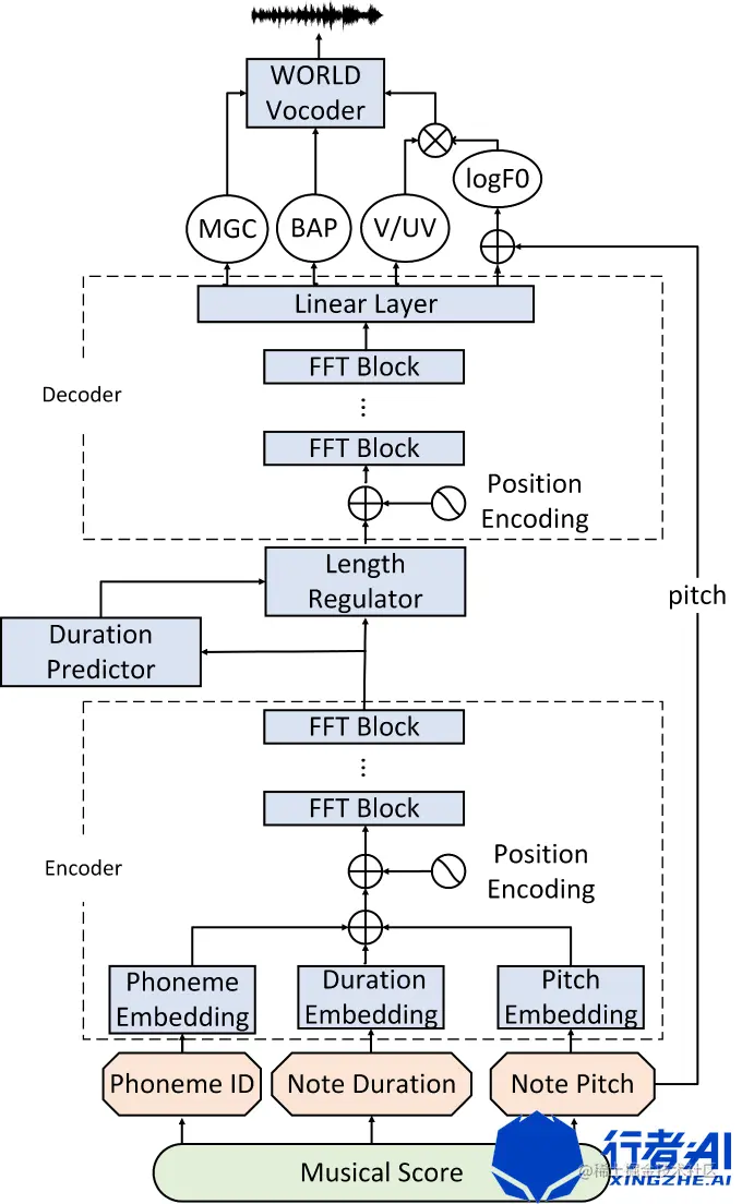 (1) 将乐谱(musical score)的音素(phoneme)、持续时间(duration)以及音高(pitch)分别经过embedding层,并add,得到musical score的embedding