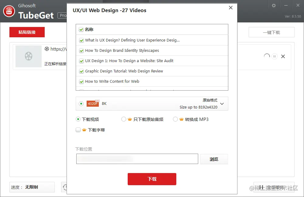那么,如何批量下载YouTube播放列表或频道里的视频呢?下载单个的视频的软件有很多,随便一搜就有很多,软件,网站,插件,用CMD命令下载等等。但是涉及到批量下载油管列表视频,网站和插件基本就不行了,只有桌面版工具可以。今天就教大家怎么批量从YouTube下载播放列表里的视频,使用的是软件-Gihosoft TubeGet,一起来看下吧!(备注:播放列表名称为UX/UI Web Design,来自:The Futur,该列表有27个视频。)